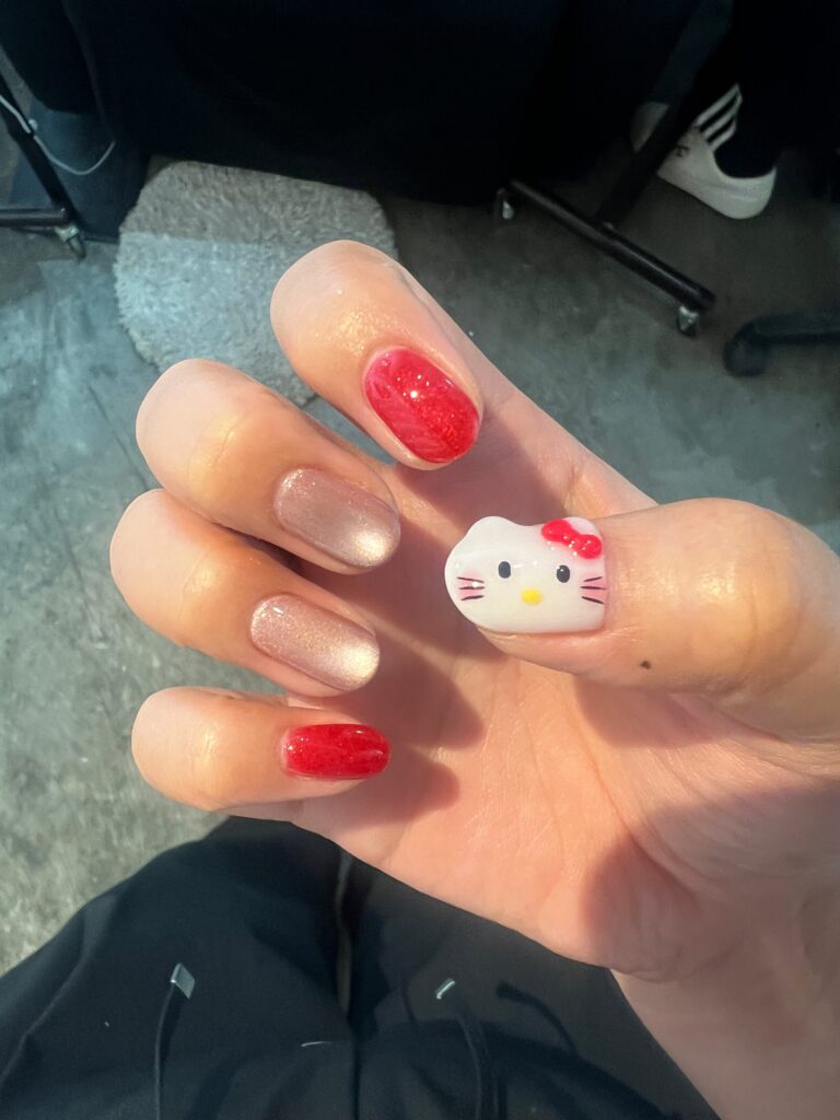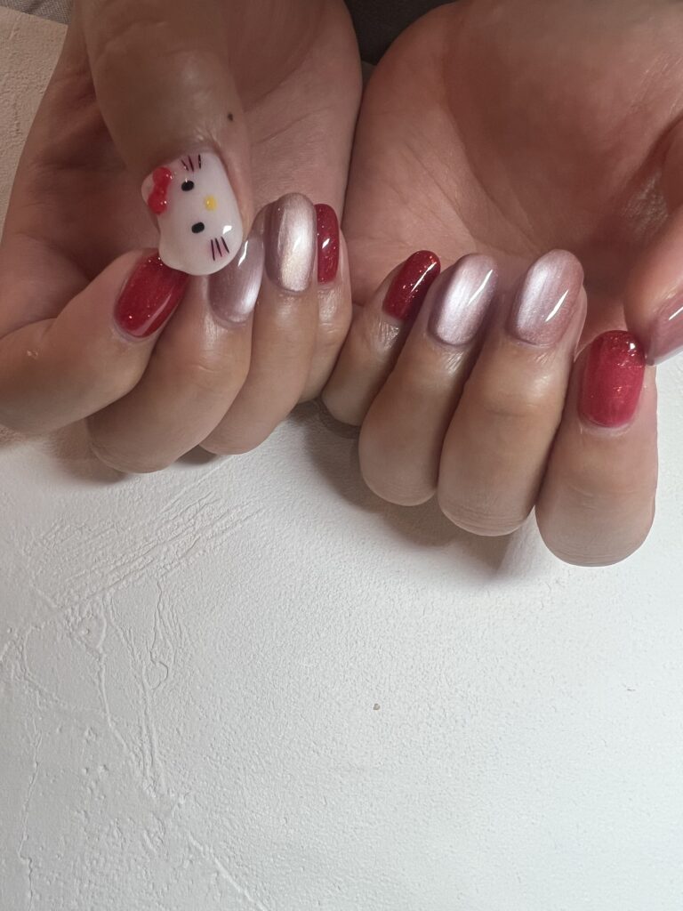 赤とピンクをベースに、1本だけキティちゃんのアートをプラス。